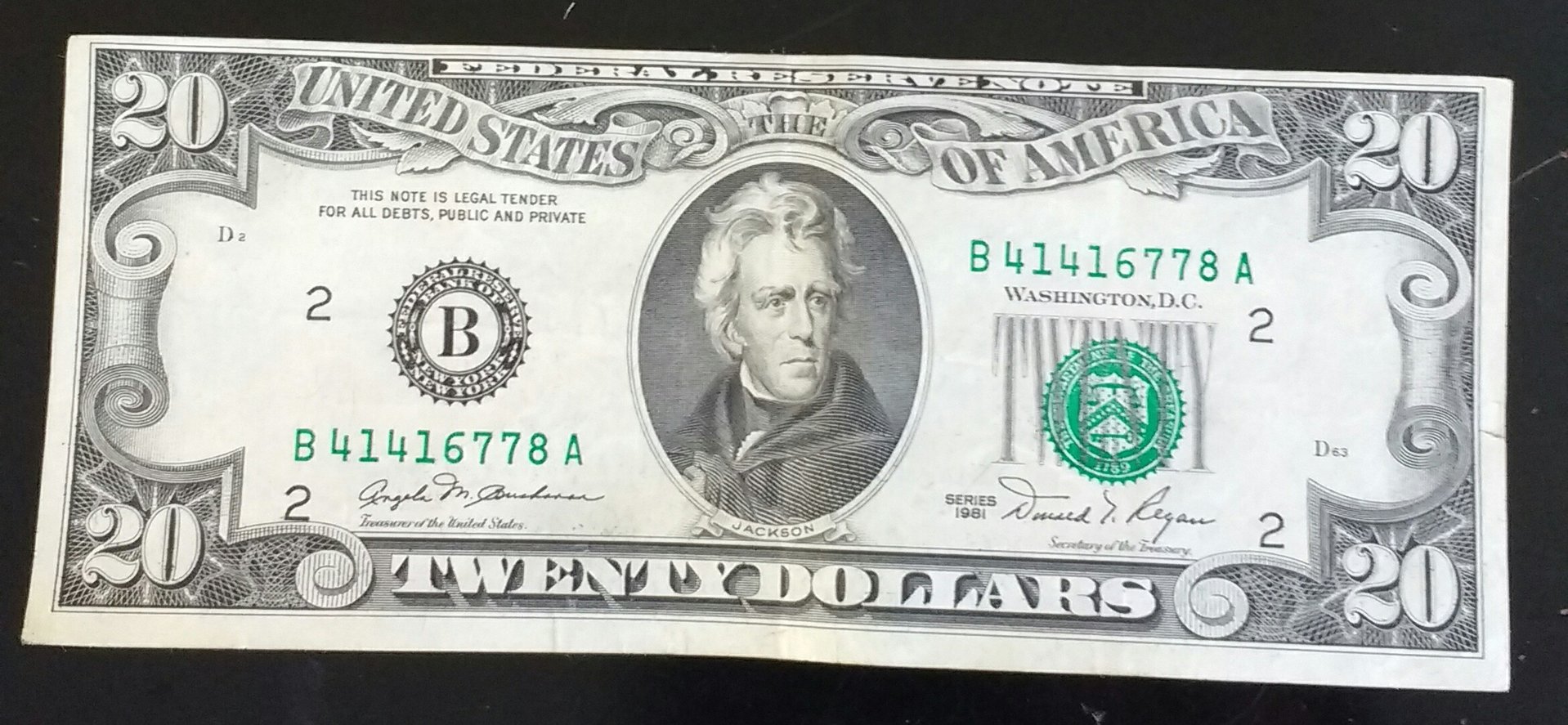 When held to light a portrait watermark of president jackson is visible from both sides of the note the note includes a color shifting numeral 20 in the lower right corner of the note.